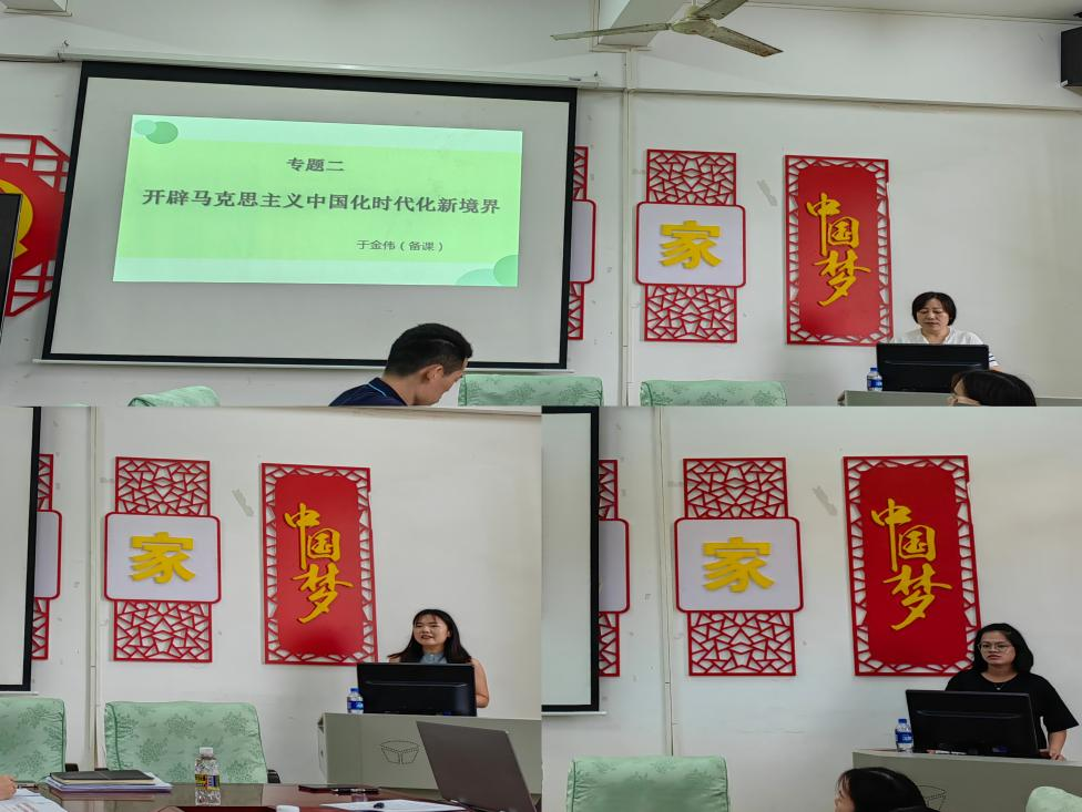 随后于金伟老师对第二专题《开辟马克思主义中国化时代化新境界》的教学目标、内容以及教学设计思路进行阐释。殷红梅老师对于此专题的教学重难点进行解释。陈婷老师运用最新案例对于此专题进行创新。