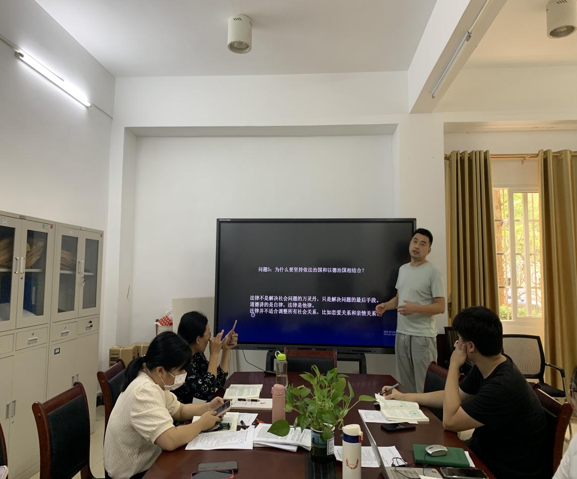 备课会结合,在场老师针对提升学生的法治素养进行了主题研讨,教师们分别从当前学生的学习特点、现实情况、活动开展、教学案例及教学手段等进行了热烈地沟通交流。针对部分教师提出的:如何做好学生关于法律来源等拓展性知识的解答,周恺老师结合中国法律的发展史进行了详细的解释。同时,老师们就如何提升学生的积极主动性分享了教学和竞赛中的经验心得,并对目前可结合课本知识的相关案例进行了探讨和筛选。