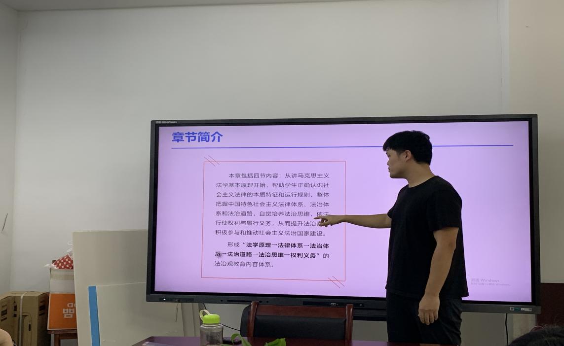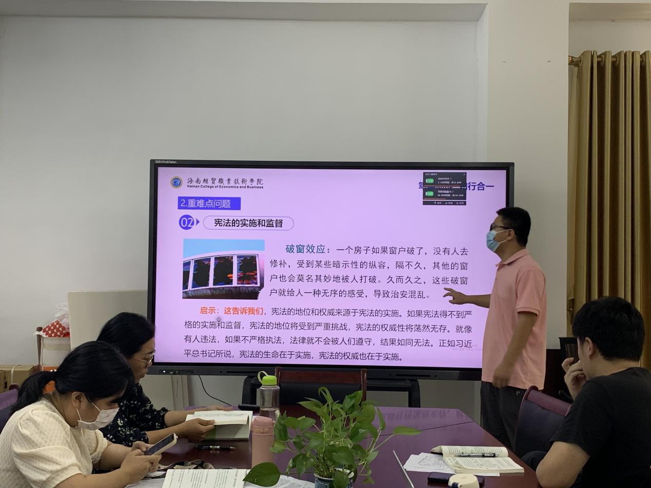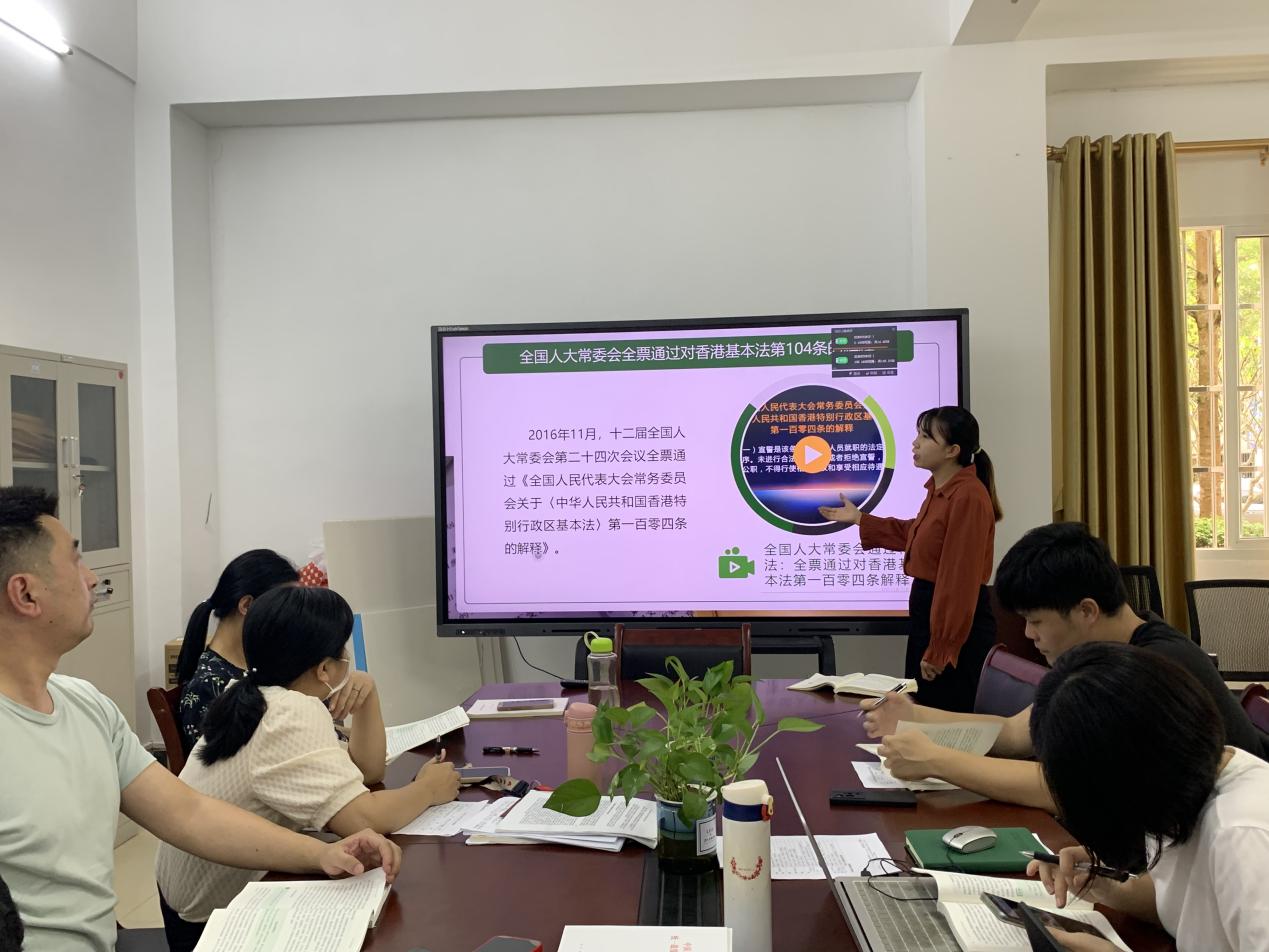 会上,针对如何引导学生《学习法治思想 提升法治素养》符夏莹老师以导图形式阐明了法治部分教学的整体思路和讲授逻辑,并分享了近期社会热点问题的导入案例;李鼎老师系统梳理了法治教学内容中的重难点问题,运用马克思主义基本原理,对相关观点、内容和论断进行了剖析;周恺老师从法律专业视角出发,精心打磨问题链式的教学设计统筹了学情和教法,拓展了参与教师的备课思路,张乐老师结合现实案例,就如何强化学生对于宪法和自身权利与义务的认识,分享了自己的理解;丁菁华老师比对了新旧教材在内容上的具体变化,并详细分析了更改的内在逻辑;陈子佳昆老师结合学生特点和教学实际,分享了德育知识“入脑入心”的教学经验,以及对综合运用媒体资源,多渠道拓宽教学思路,丰富教学手段的看法和心得。