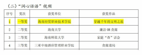 2025年1月3日,中共海南省委教育工作委员会公布2024年“清廉文化进校园”系列主题活动获奖作品,海南经贸职业技术学院beats365亚洲版官网殷红梅、李鼎、吴春雨、王艺霏团队的作品《穿越千年的文明之旅》在系列主题活动中脱颖而出,荣获“润心话语”视频组一等奖。