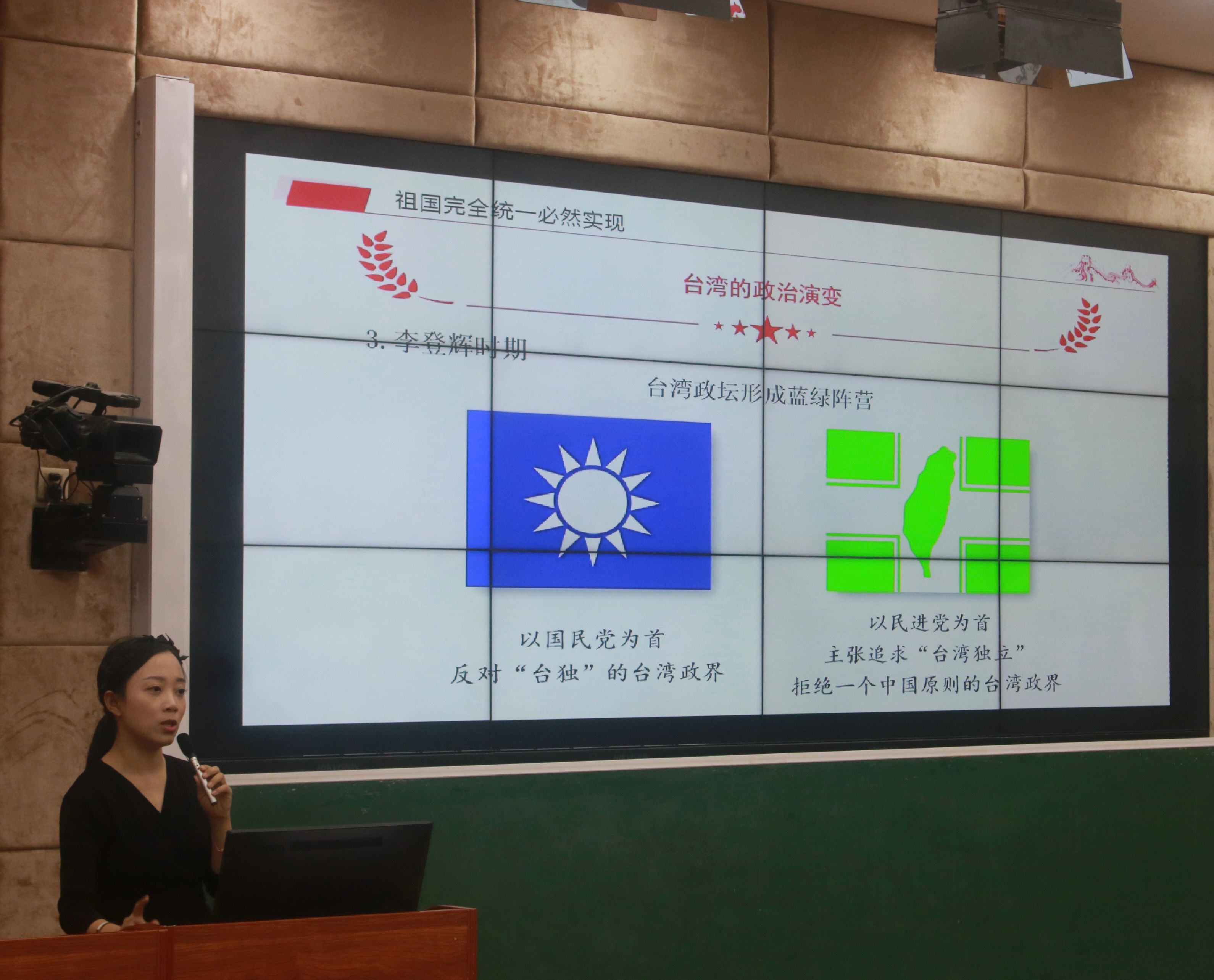 于赫老师就《祖国完全统一必然实现》这一章节进行授课,通过详细分析台湾的政治演变路径,清晰地为大家理清了台湾问题的前世今生,找到台湾形势依然严峻的原因所在,在此基础上,从历史、经济社会发展、民心所向、国际环境和中国梦这五个维度讲述了祖国必然实现完全统一的信心和条件。并就此对青年学生发出号召,希望大陆青年和台湾青年学生一道勇担重任,和衷共济,共同奋斗,就一定能够实现中华民族伟大复兴的中国梦。语言优美,紧扣时事,感情充沛。三位老师的精彩授课获得了参会老师的阵阵掌声。