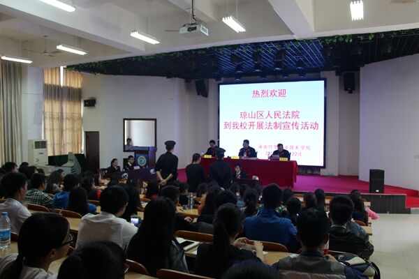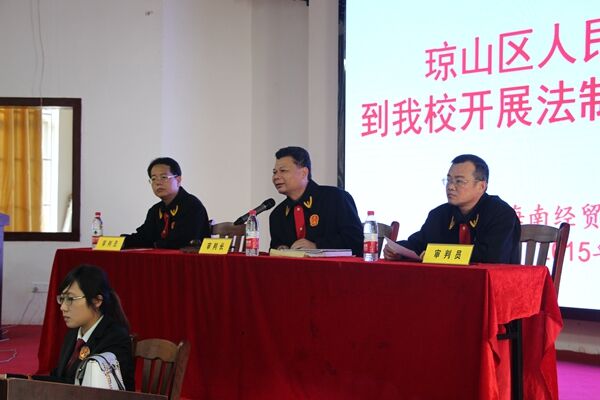 2015年12月22日下午,我校邀请海口市琼山区人民法院、海口市琼山区人民检察院到我校举行公开庭审活动,给2015级学生代表上了一堂极富教育意义、生动的法制宣传教育课。