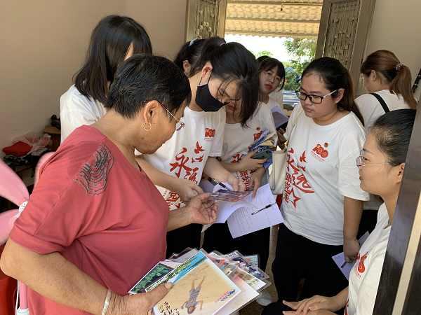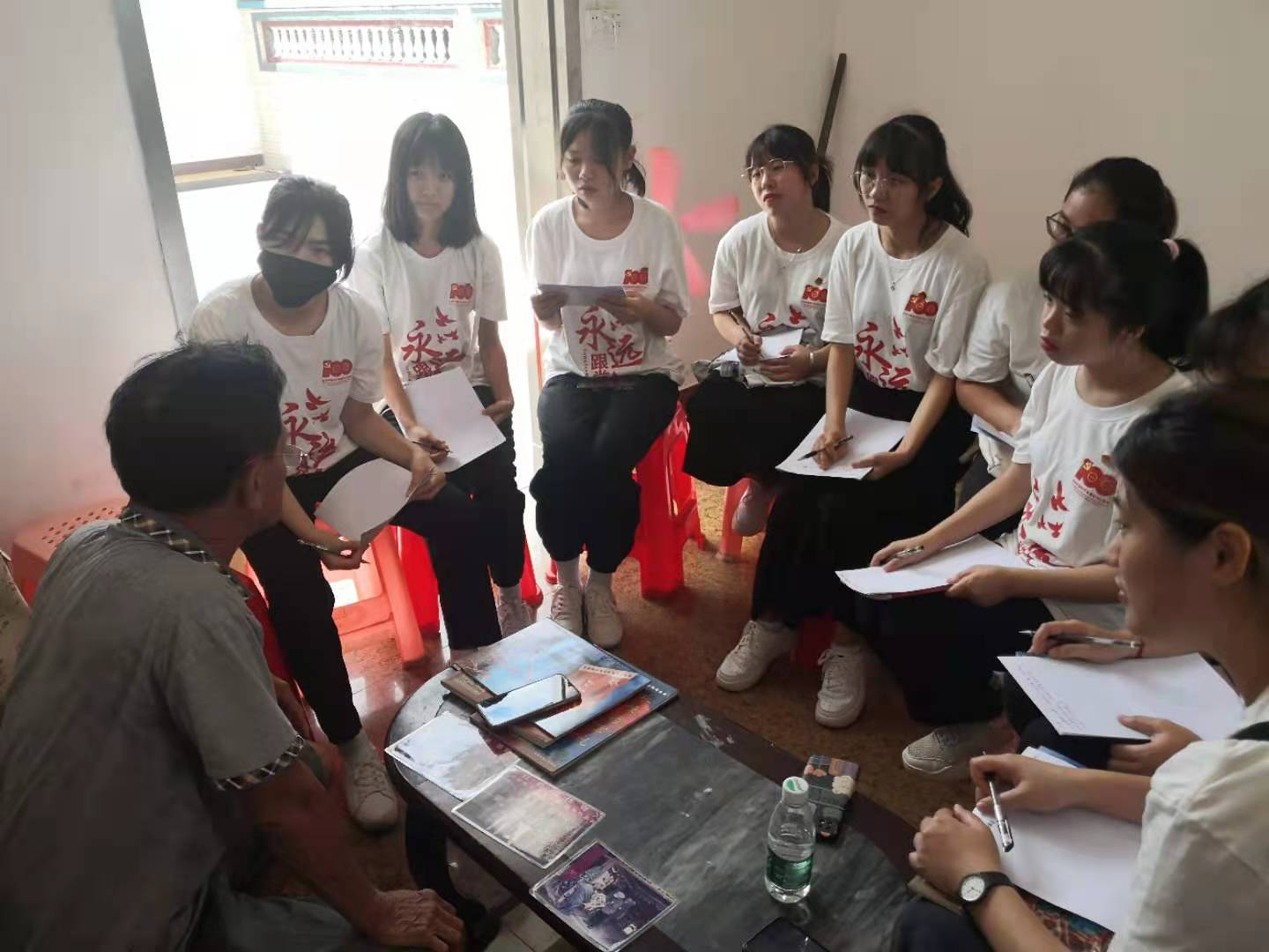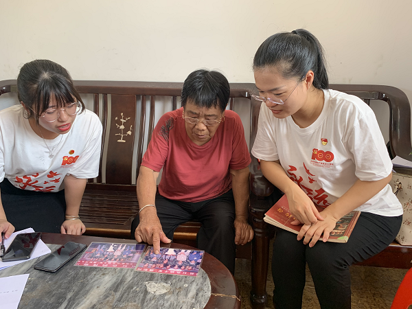 在拜访中卢业香老人的儿媳妇拿着当年红色娘子军的照片给团队同学讲解红色故事。卢业香老人于2014年4月在排田村家中去世,是海南最后一位去世的红色娘子军战士,享年100岁。1931年,年仅17岁的卢业香在党的号召下离开家乡参加红军,曾任红色娘子军二连二排二班长,她参加过“伏击沙帽岭”“攻打文市炮楼”等一系列战斗,娘子军屡建战功,用战绩证明了“妇女能顶半边天”。